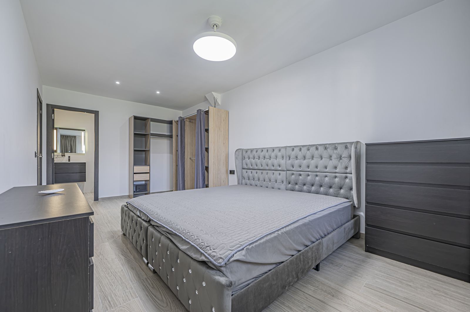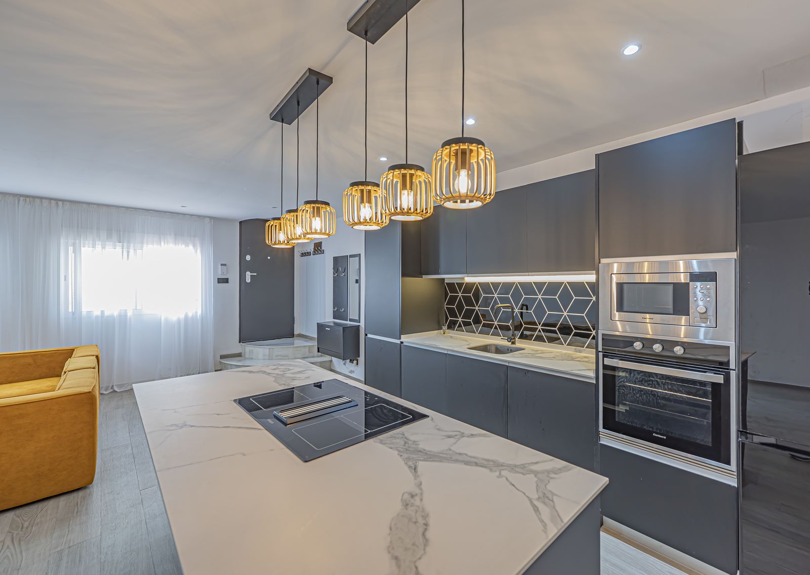 This fully renovated ground-floor apartment comprises two bedrooms, two bathrooms, and a living room with an open-plan kitchen.