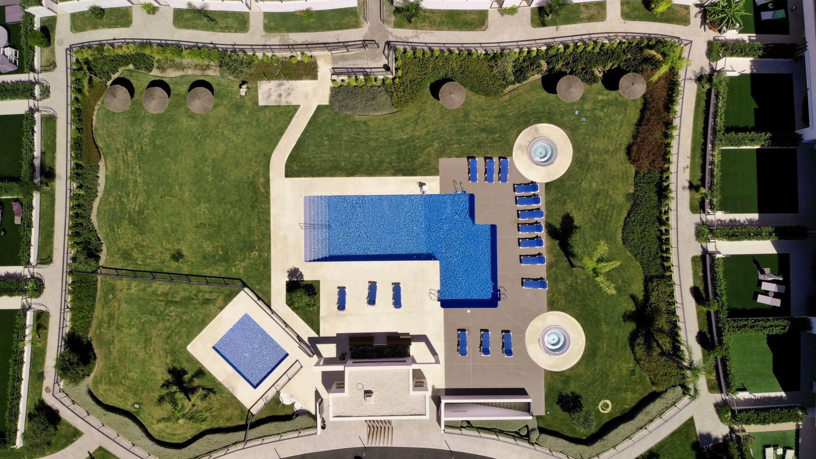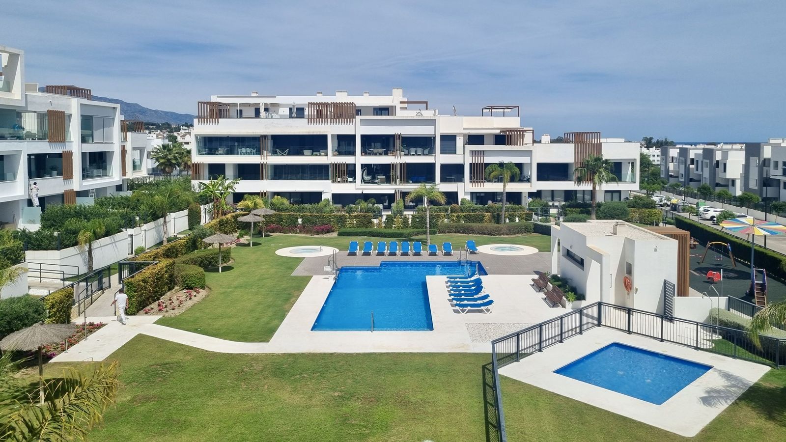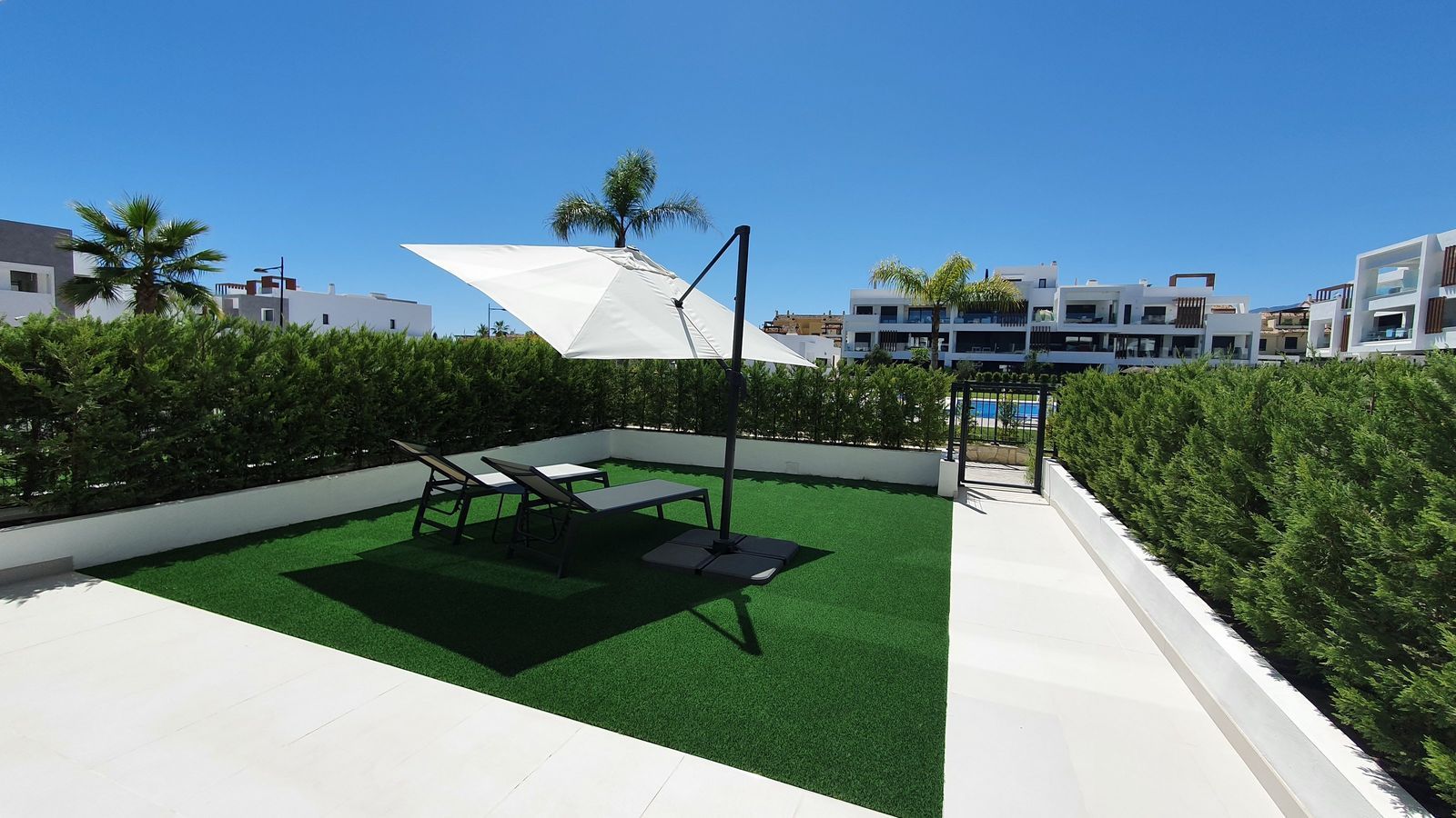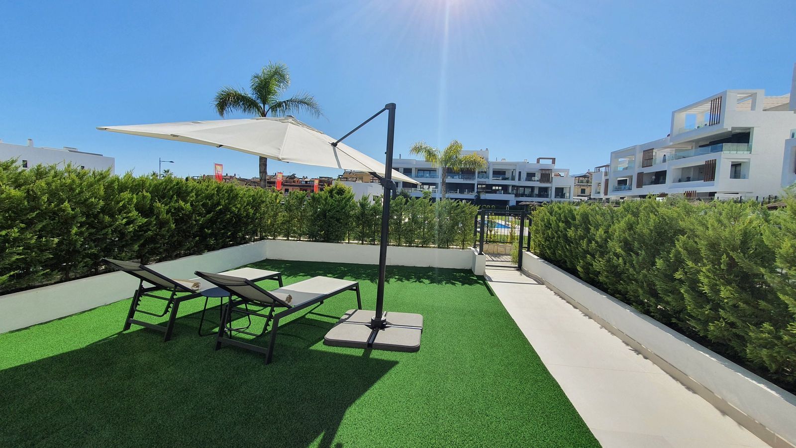 The garden connects directly to the tranquil communal areas featuring beautifully landscaped Mediterranean gardens, swimming pools, jacuzzis, and a children’s play area.