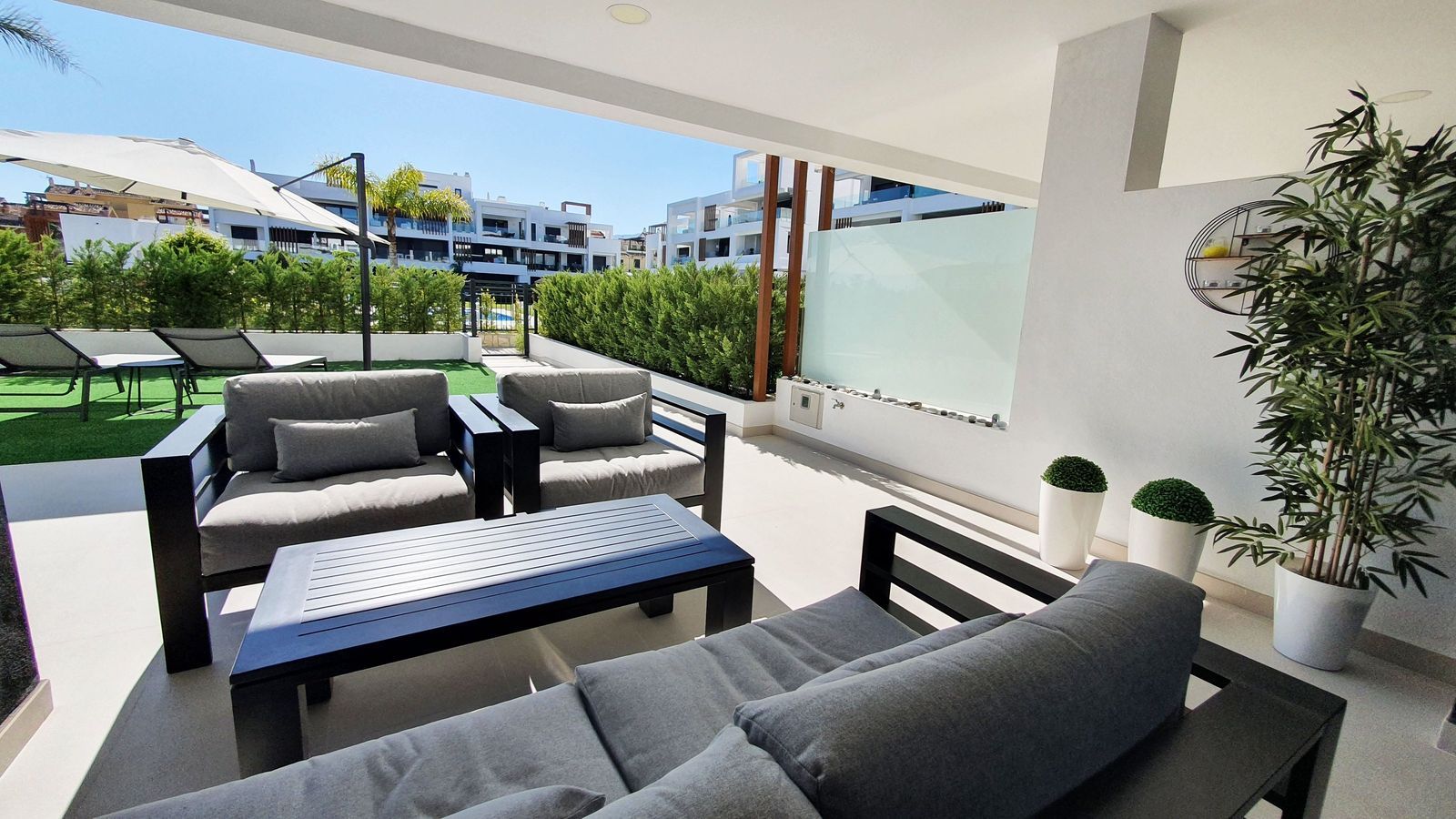 This stunning ground-floor apartment in Los Miradores del Sol Phase I perfectly combines contemporary luxury with Mediterranean indoor-outdoor living on Estepona’s exclusive New Golden Mile. Offering 92 m² of elegant interior space and an impressive 84 m² of private terraces and gardens, it’s ideally located just a short walk from the beach, shops, and restaurants.
