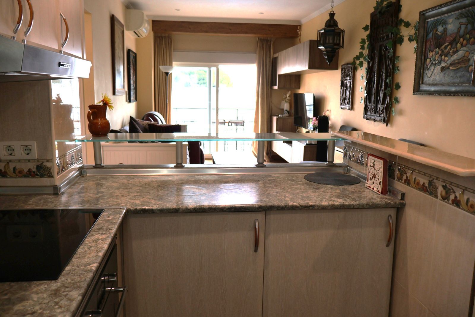 From the living room, you can access the lovely terrace, ideal for soaking up the morning sun and enjoying a relaxing view of the pool—a perfect spot for breakfast or unwinding. The apartment is elegantly laid out with ample storage options to make everyday life easier and more organized.