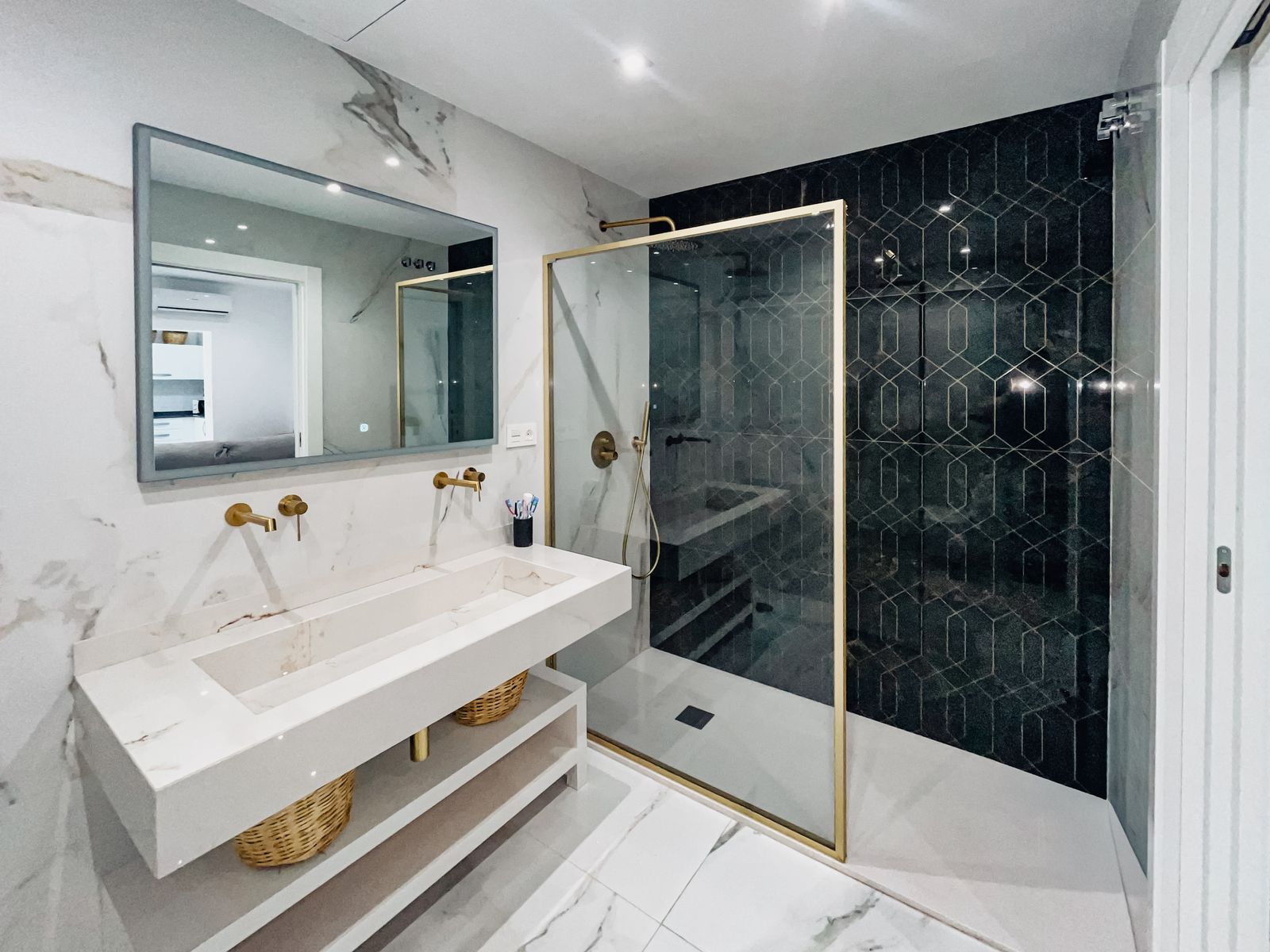 The bathroom, also fully renovated, boasts high-quality finishes with marble details that add an elegant and contemporary touch.