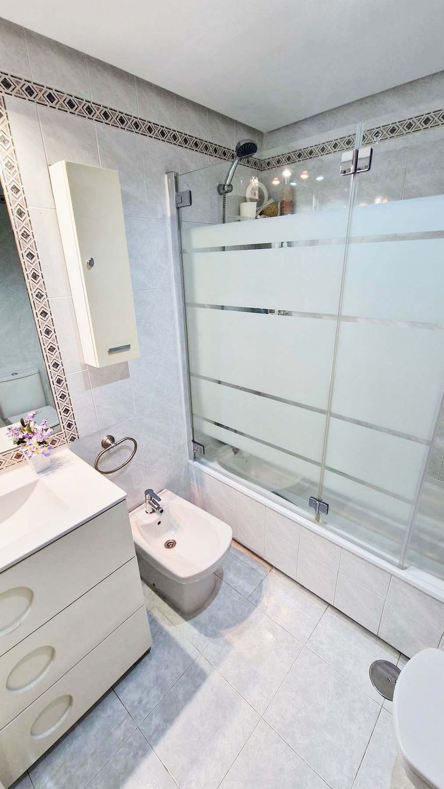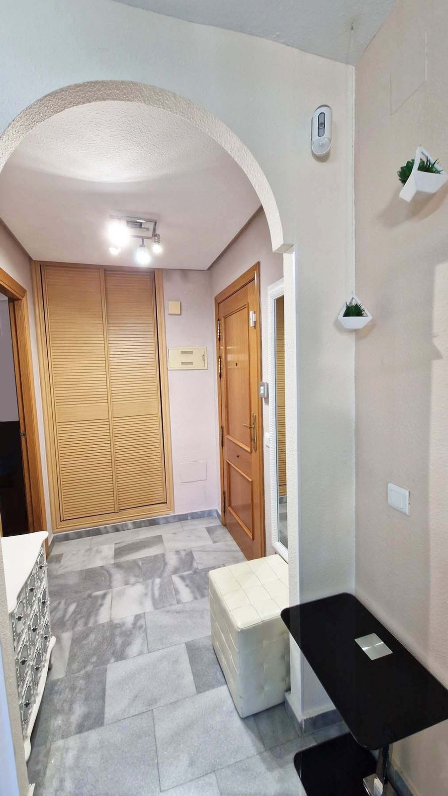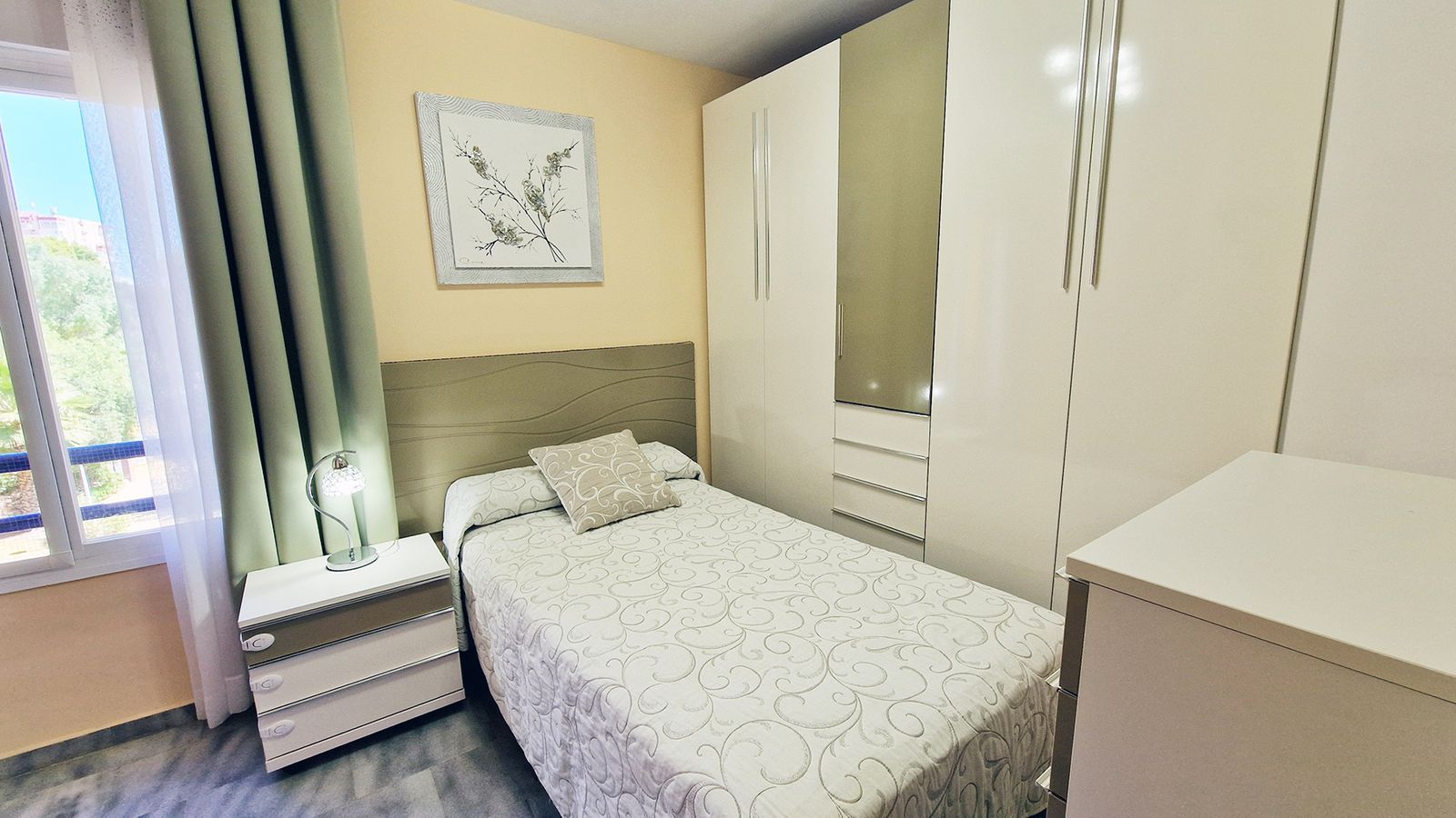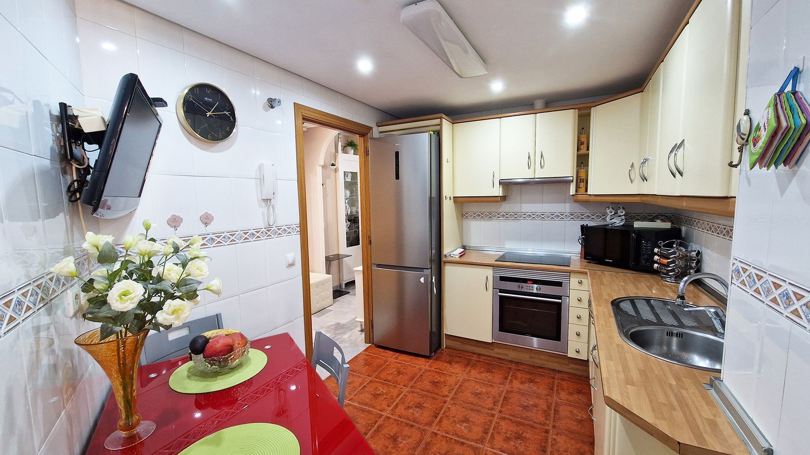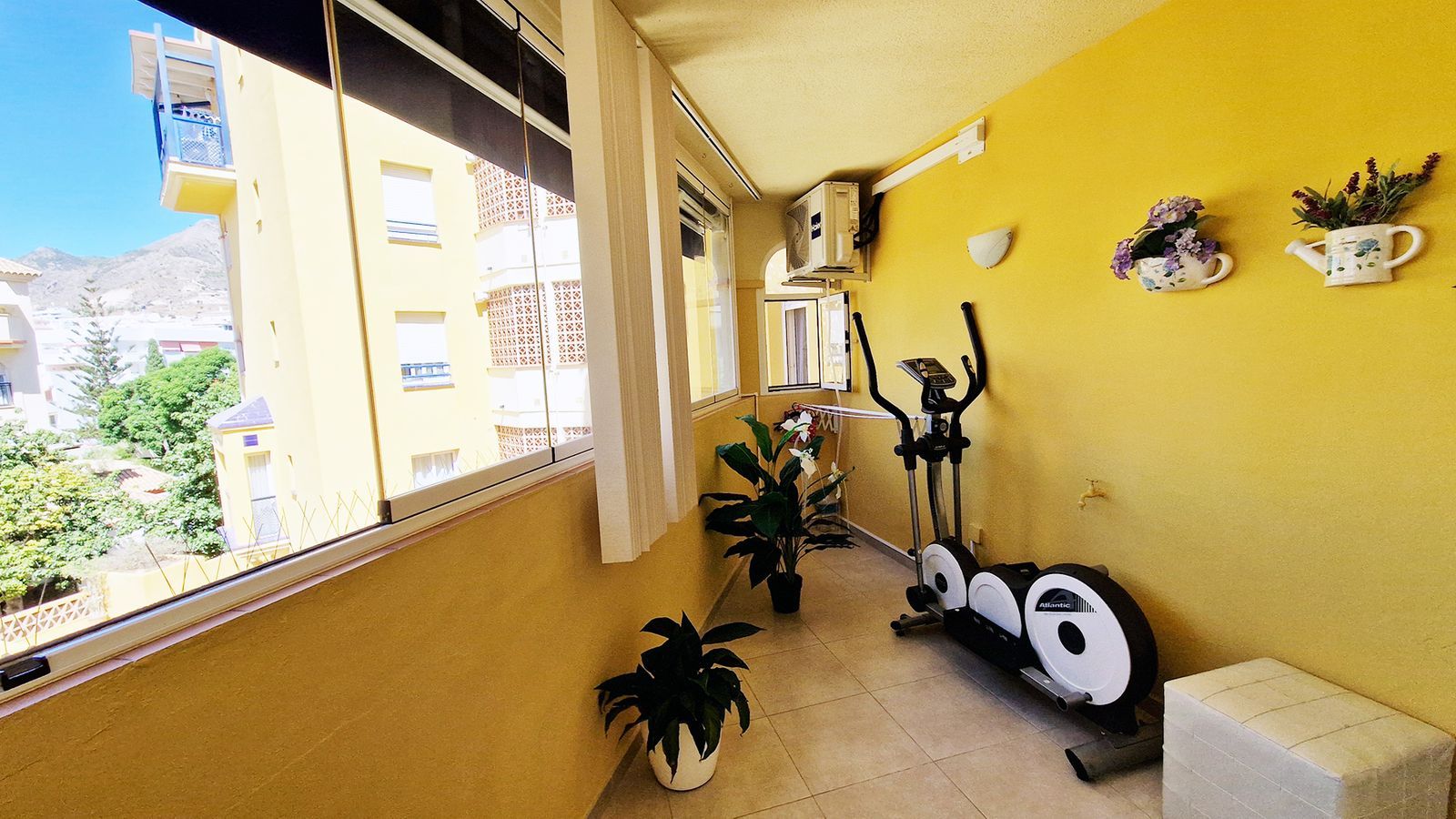 Two bedrooms with wardrobes and one bathroom – ideal for families or hosting guests. The private terrace can be closed off with glass curtains installed by the owners, along with electric blinds. Garage space is included in the price and has facility for charging electric cars.