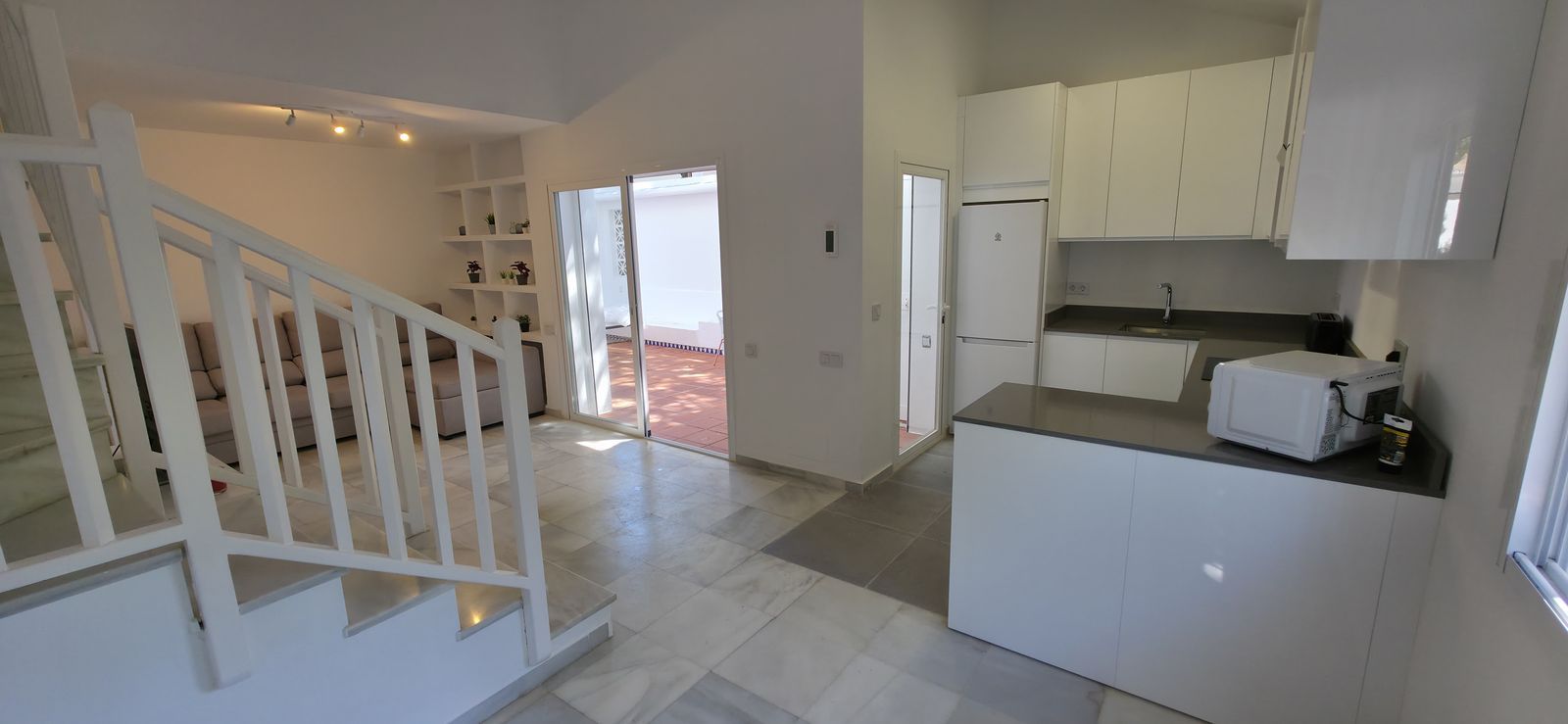 Corner Townhouse beachside between San Pedro and Estepona. Recently reformed this 4 bed 3 bath property sits in the wonderful Benamara complex walking distance to the beach. Modern brand new open plan kitchen leading to the dining and living area. 2 bedrooms on the ground floor sharing one bathroom. Large terrace with seating area and laundry room. Upstairs a further 2 bedrooms and 2 bathrooms. Master bedroom with en suite and terrace overlooking the beautiful gardens and pool area. The property has been reformed to a good standard with new electrics, air conditioning, 2 new bathrooms and new windows.