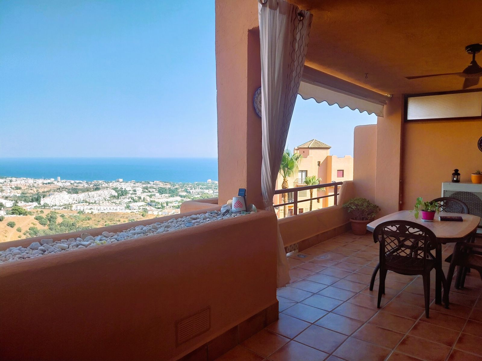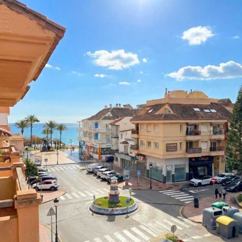This stunning and impeccably maintained apartment is perched in the upper part of Calahonda and boasts the most spectacular panoramic sea views in the entire development. It features two spacious bedrooms, two bathrooms (one en-suite), rustic-style ceramic flooring, a jacuzzi in the master bathroom, and a fully renovated and equipped kitchen with high-quality finishes. The property also includes a generous covered terrace, a laundry room, and a private rear patio. Everything is in perfect condition and ready to move into.