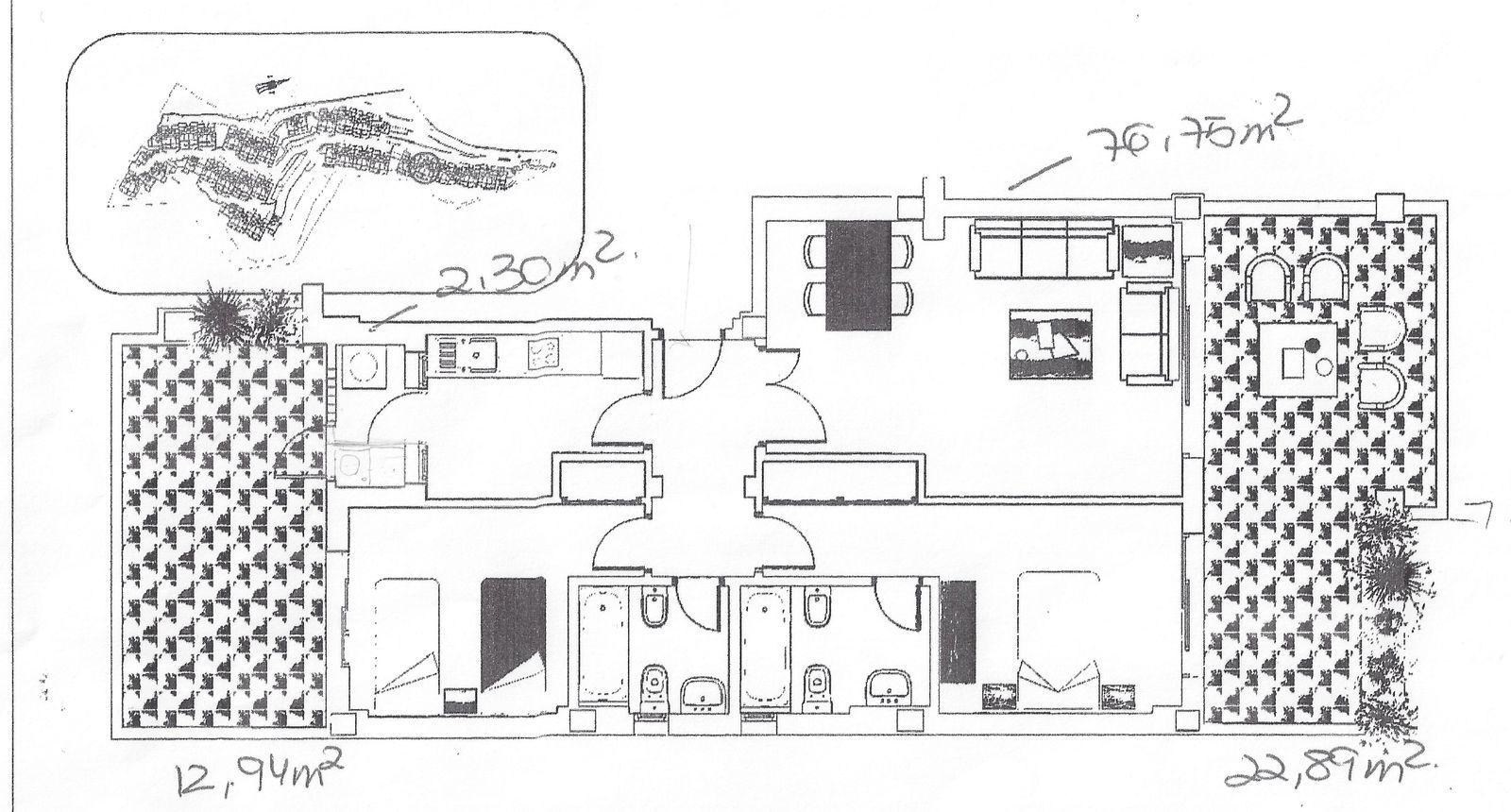 There are two double bedrooms with built-in wardrobes and two full bathrooms. The master bedroom offers direct access to the terrace and has an en-suite bathroom with a jacuzzi.