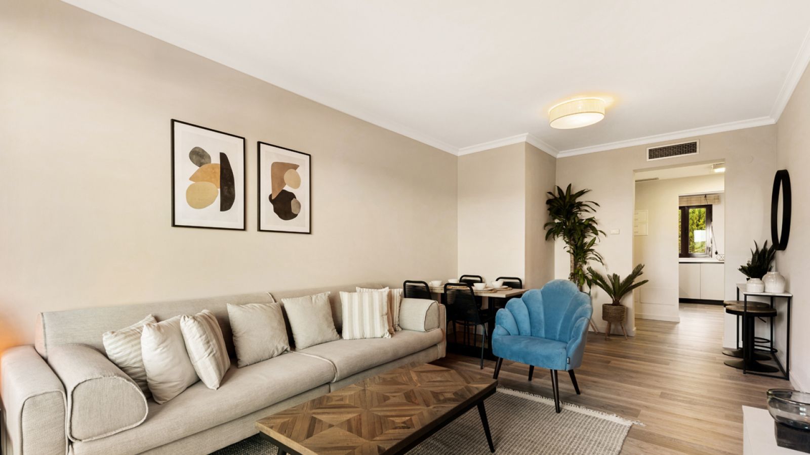 The two-bedroom, two-bathroom apartment has been fully renovated and is equipped with top-of-the-line appliances. It features a luxurious contemporary design with authentic Andalusian details, a spacious private terrace, and a large living room designed by an award-winning interior design firm.