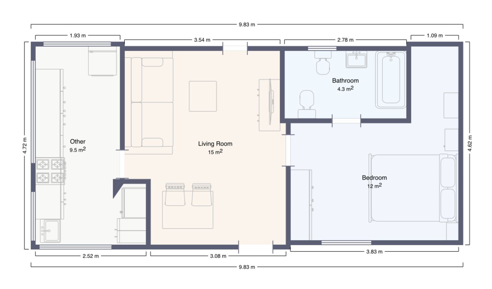 The apartment features a minimalist and comfortable design. It includes a full bathroom with both a shower and bathtub. The separate kitchen not only maximizes space in each area but also offers the opportunity to customize it and make it feel like home from day one. The generous bedroom has ample room to organize your belongings, and the living area easily accommodates a sofa and a dining table for four.