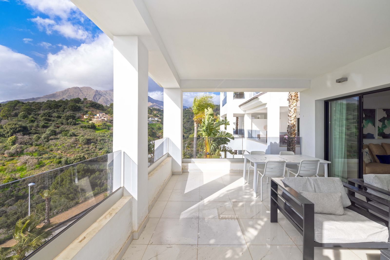 The property features 2 bedrooms and 2 bathrooms, arranged in a bright and spacious layout where every detail has been carefully considered to ensure maximum comfort. The living room, with floor-to-ceiling windows, opens onto a private west-facing terrace that enjoys impressive panoramic views of the Estepona mountain range and stunning sunsets over the Costa del Sol.