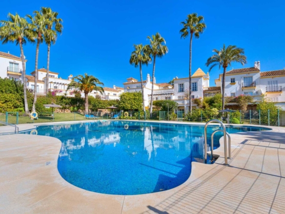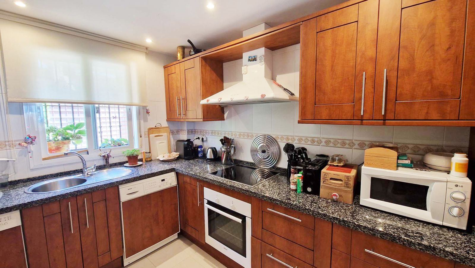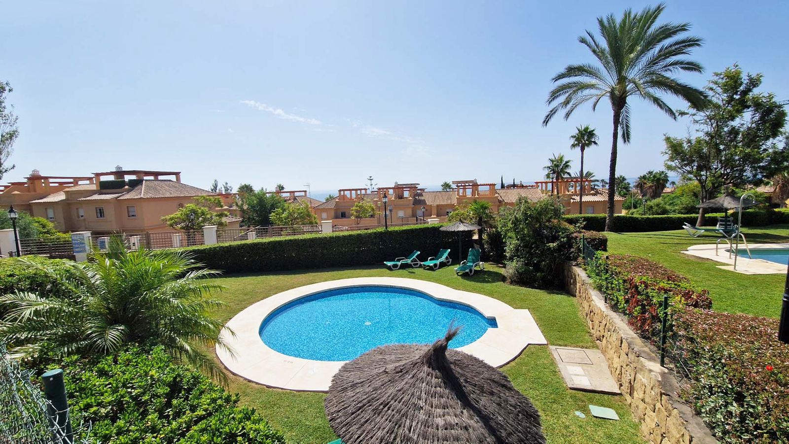 VERY NICE SEMI-DETACHED HOUSE WITH SEA VIEWS FOR SALE IN ESTEPONA!! This corner townhouse is located in the sought-after, secure, private development of Galera Park. Located 200 meters from the seafront, its location within the development protects it from the noise of the coastal road. The house is built on four floors. All floors have an elevator. The first level is the private underground garage, where two vehicles can easily be parked. The owner replaced the garage door with a much better-quality automatic one when he bought the property. The second floor consists of a beautiful living/dining room, a fully equipped semi-open kitchen, and a guest toilet. The living room leads out onto a charming terrace with a bit of sea view and a large, pleasant private green area overlooking the pool and the sea. On the first floor, there are three bedrooms and two bathrooms. The master bedroom has an en-suite bathroom and leads out onto a terrace that provides access to the fourth floor, the solarium, from where you can observe the surroundings and enjoy splendid sea views. You can see the sea from the living room terrace and also from the master bedroom terrace. The house has always been very well maintained by its owners, who even soundproofed the side wall of their only neighbor. Many shops are nearby, including two large supermarkets! This property is being sold partially furnished. All appliances remain. Ideal property for a family, either as a primary residence or for vacations.