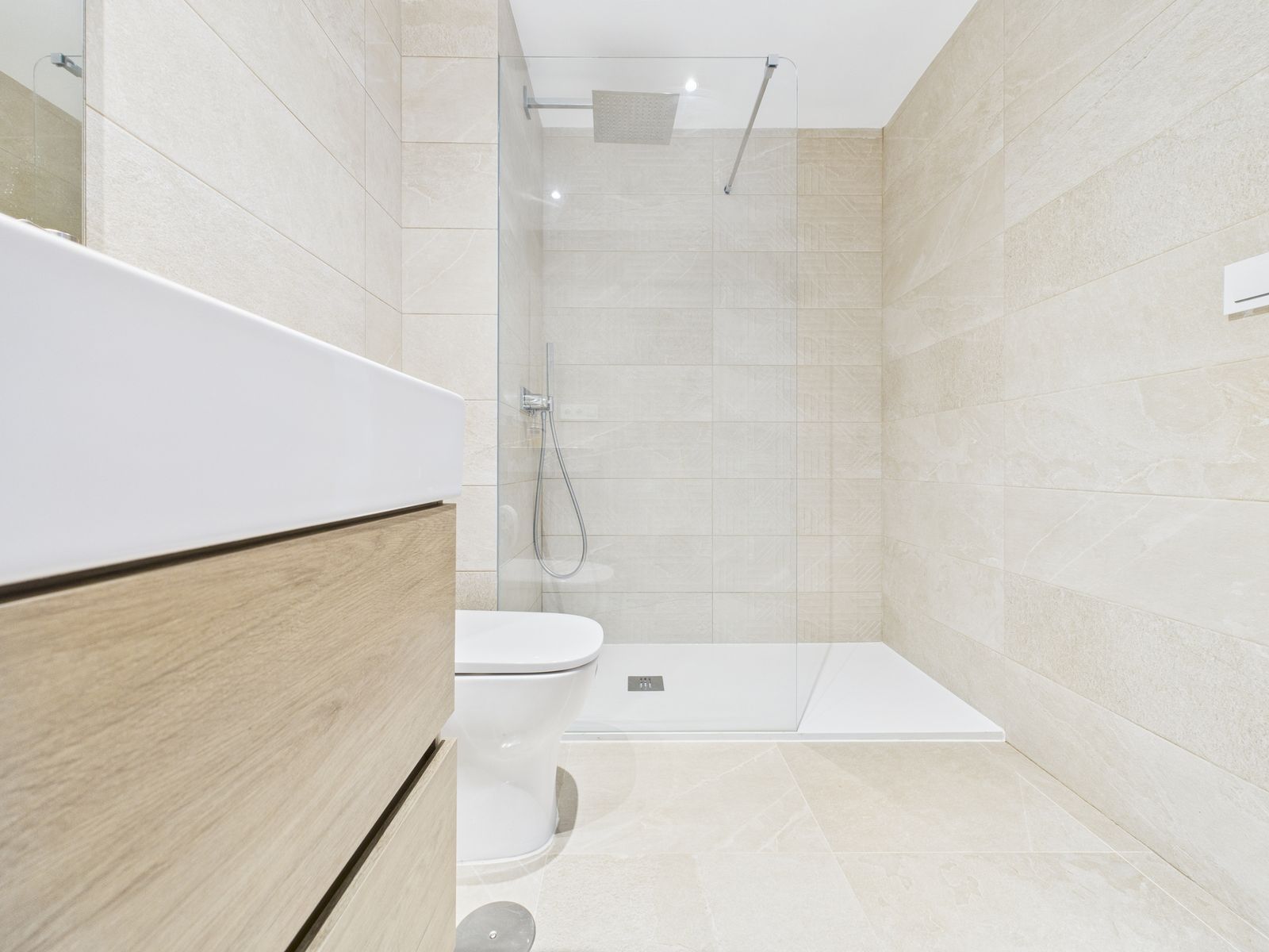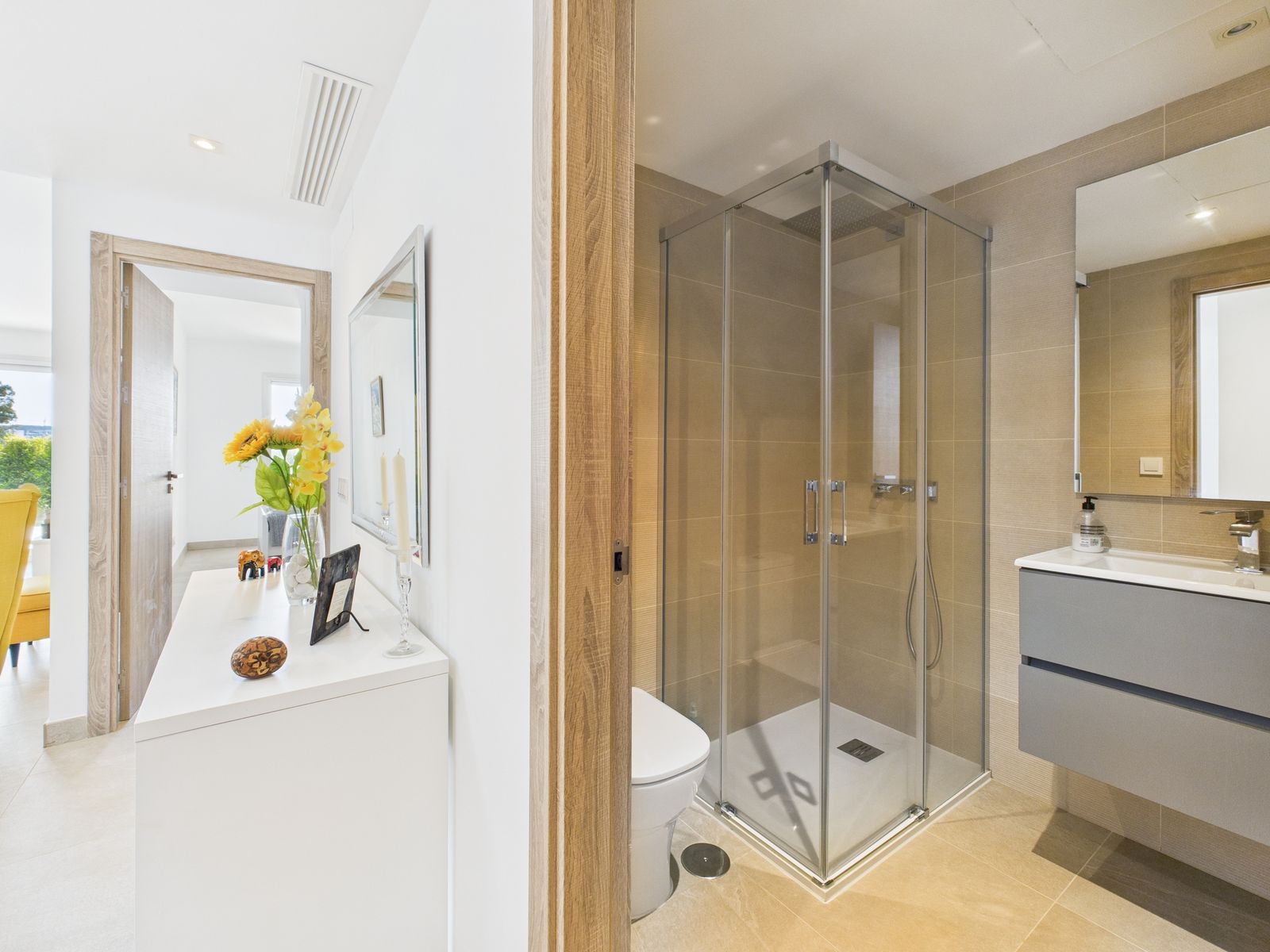 Completed in 2024, the apartment enjoys a bright and spacious open-plan layout, featuring a generous living and dining area that flows seamlessly onto a private terrace with garden and mountain views. With its southwest orientation, the property benefits from sunshine throughout the afternoon and spectacular sunsets over the surrounding hills.