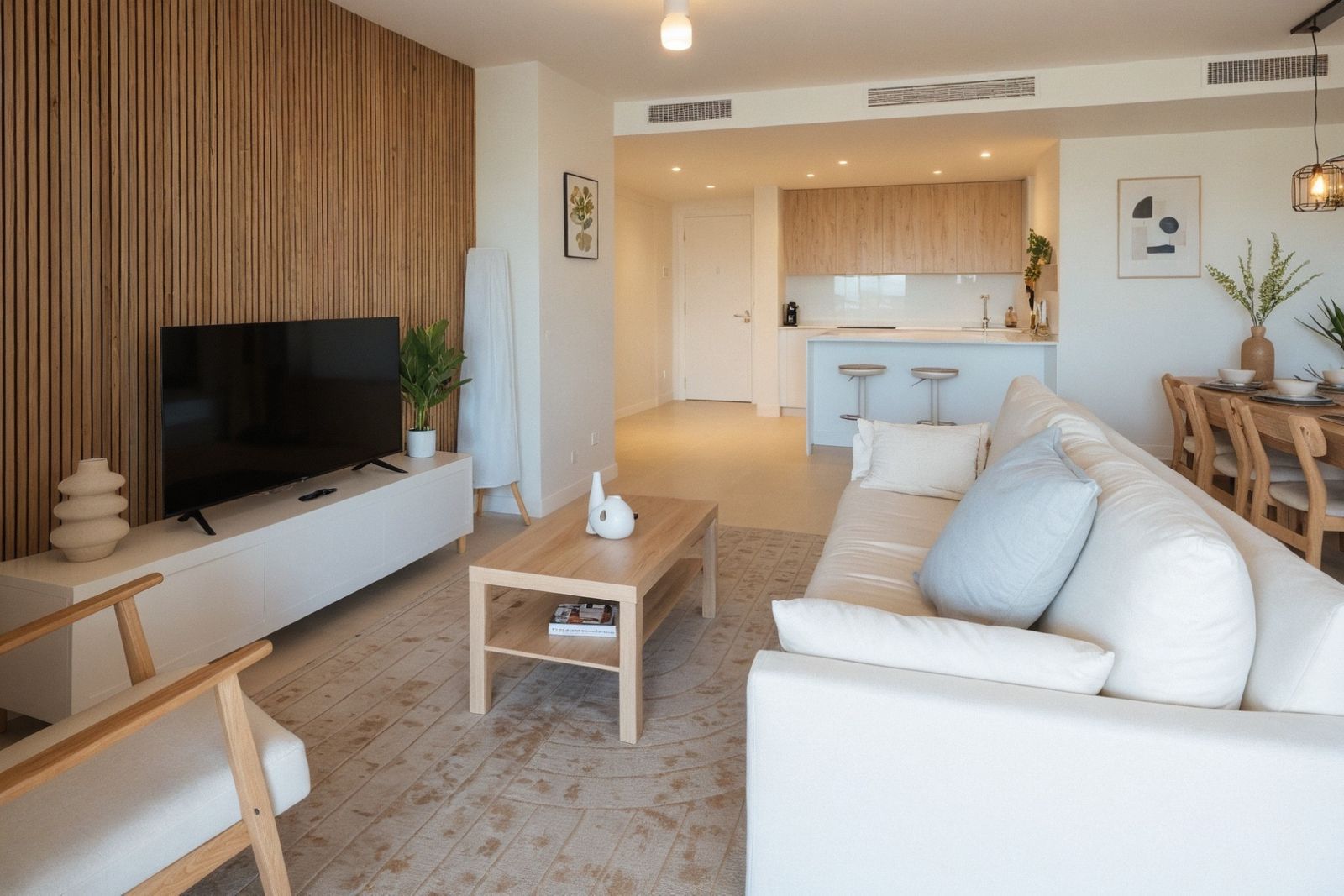 The modern kitchen, open to the living area, is fully equipped with high-quality appliances and ample storage, making it a functional yet stylish space for cooking and entertaining.