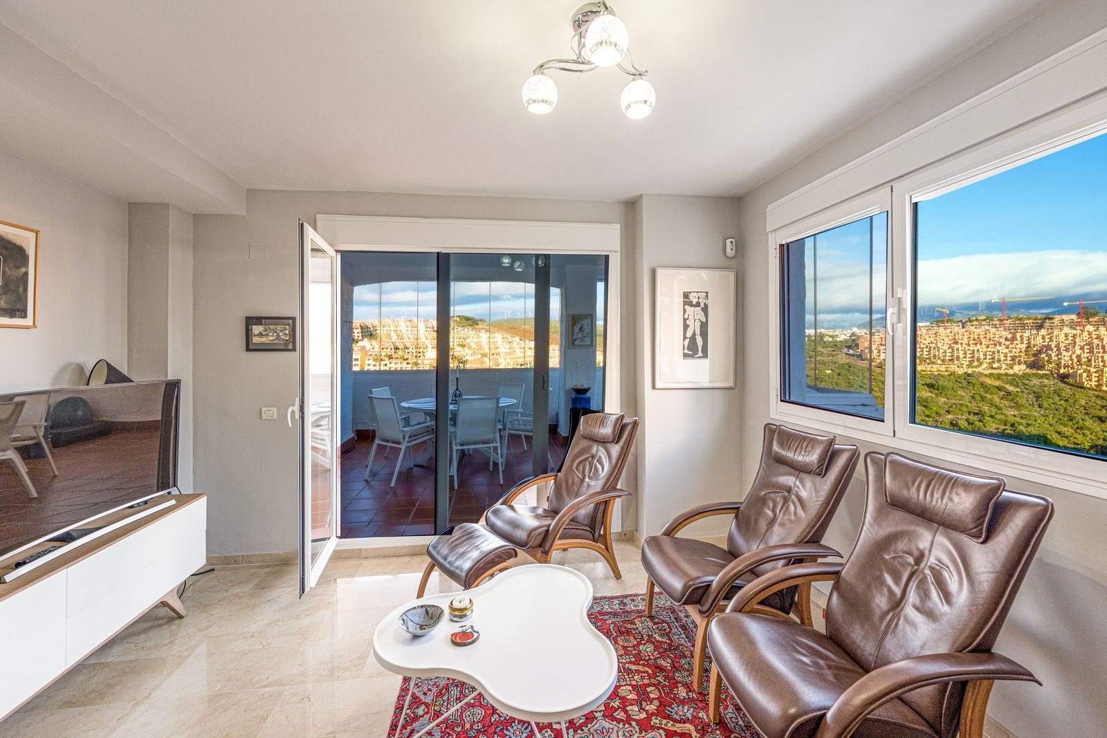 From the main terrace, you can enjoy views of the communal swimming pool and landscaped gardens, while the front terrace, accessible from the bright living room and the master bedroom, has been enclosed with Lumon glass curtains. This additional space creates a perfect area for reading, dining, or simply enjoying the panoramic views of La Duquesa Golf Course, the surrounding mountains, and the peaceful Andalusian countryside.