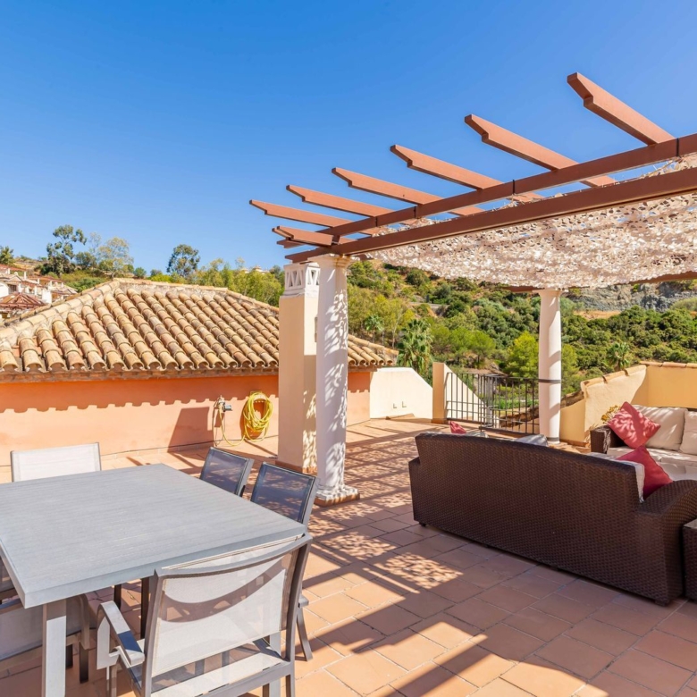 The specification is premium: fully fitted kitchens, hot & cold air conditioning, solar panels, landscaped communal gardens, and a heated communal pool. The community is gated, secure, and built in low-rise blocks (just 3 storeys), some crowned with penthouse terraces with pergolas. The design combines Mediterranean stylistic touches with contemporary interiors. Its location is excellent: only minutes from Benahavís village, the beaches of Marbella and San Pedro, plus many of the region’s best golf courses nearby.
