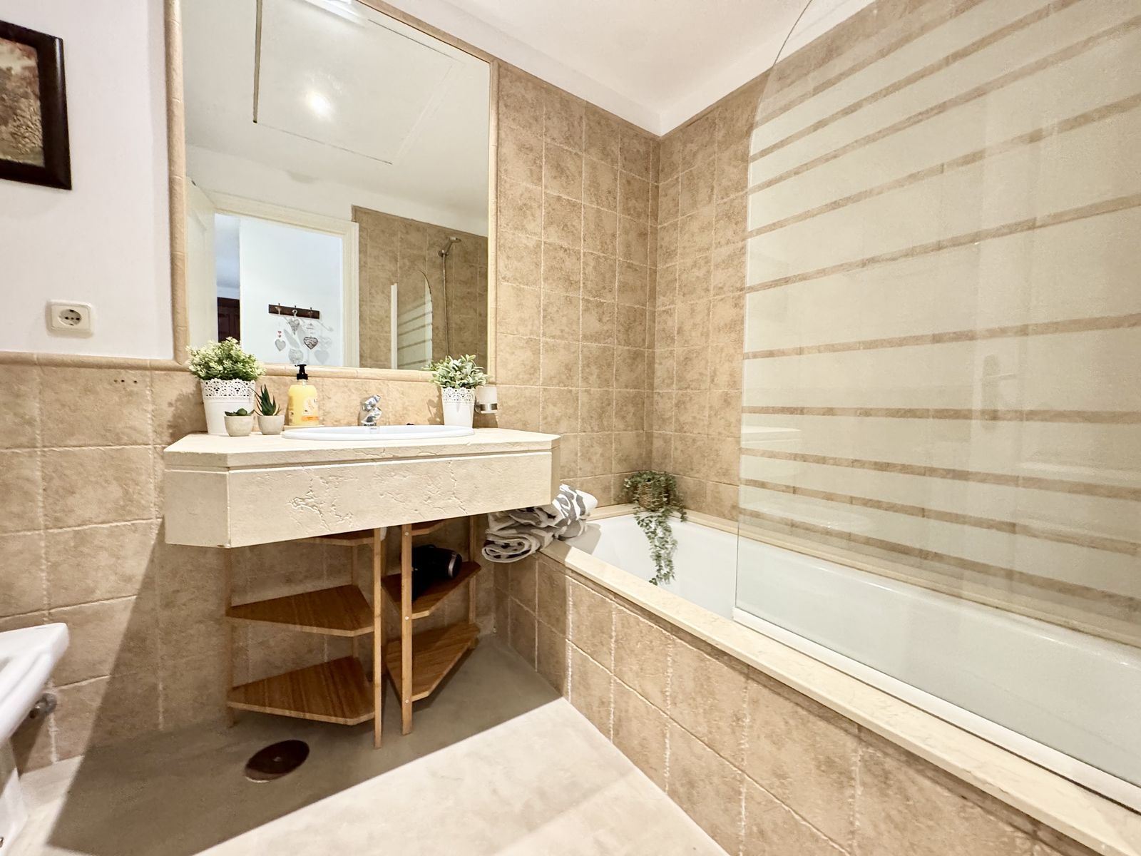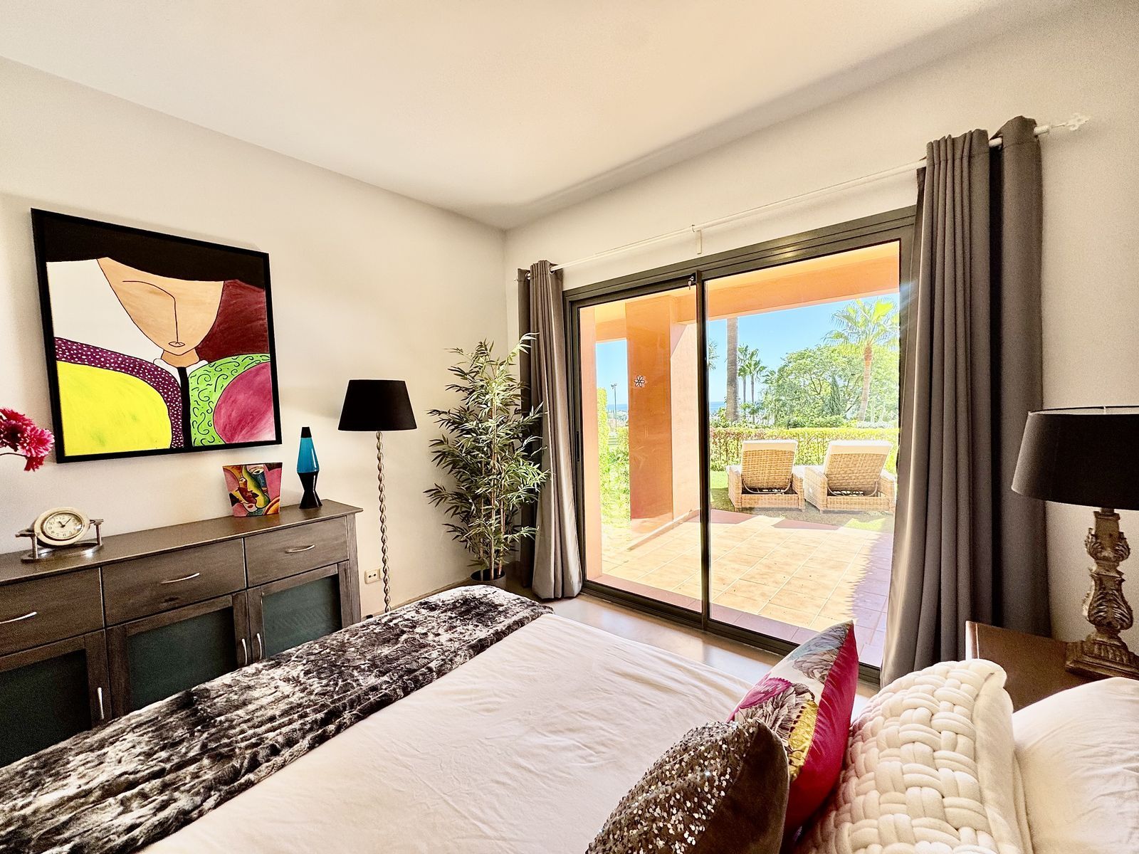 This beautiful ground-floor apartment boasts fabulous views of the sea and golf courses. Located in the exclusive Royal Flamingos community, next to the 5-star Villa Padierna Hotel, it features a master bedroom with an en-suite bathroom, a second bedroom with a separate bathroom, and a fully equipped kitchen with a utility room.