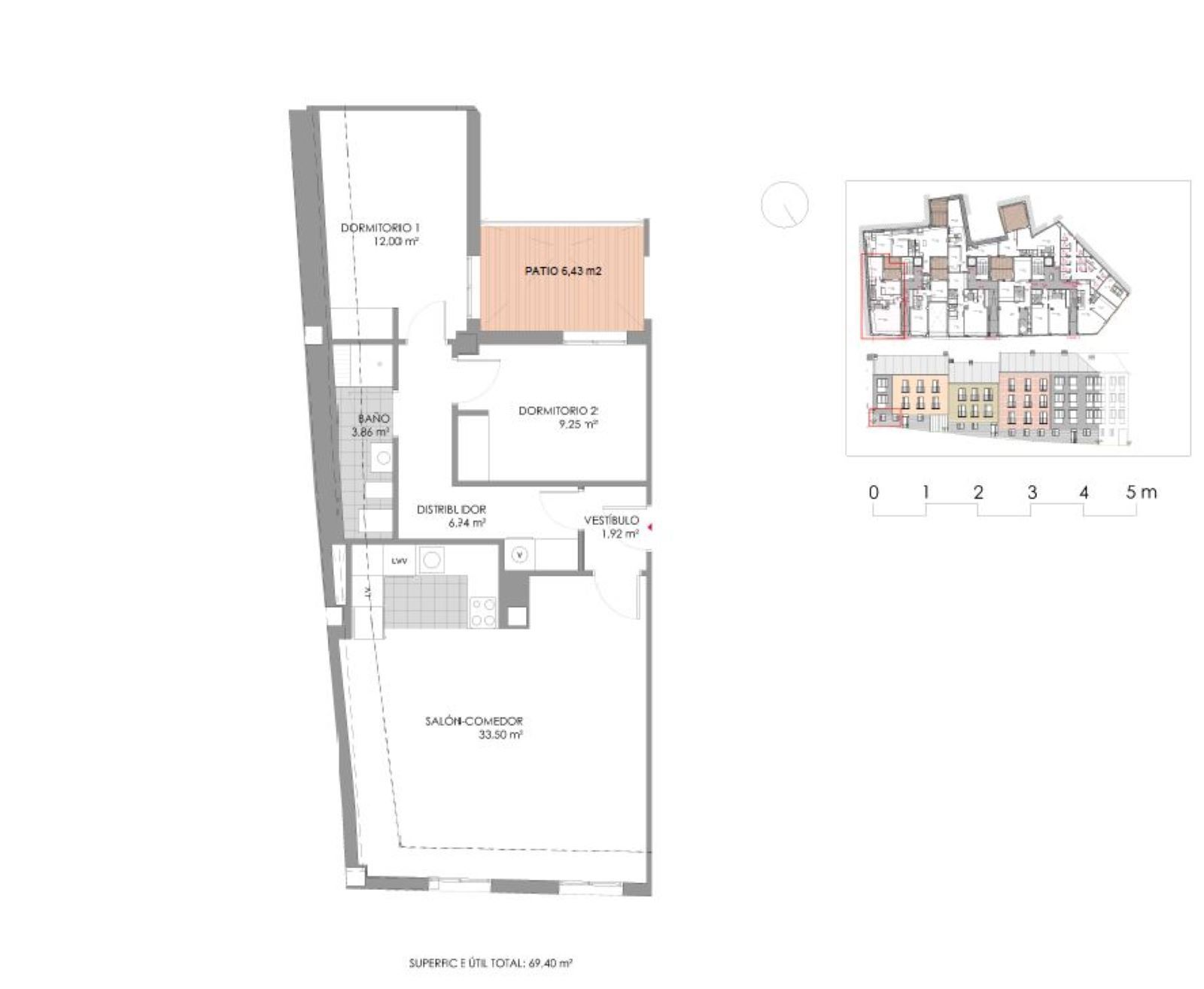 The flat has a living-dining room, open plan kitchen, two bedrooms, a bathroom and an interior terrace for private use.