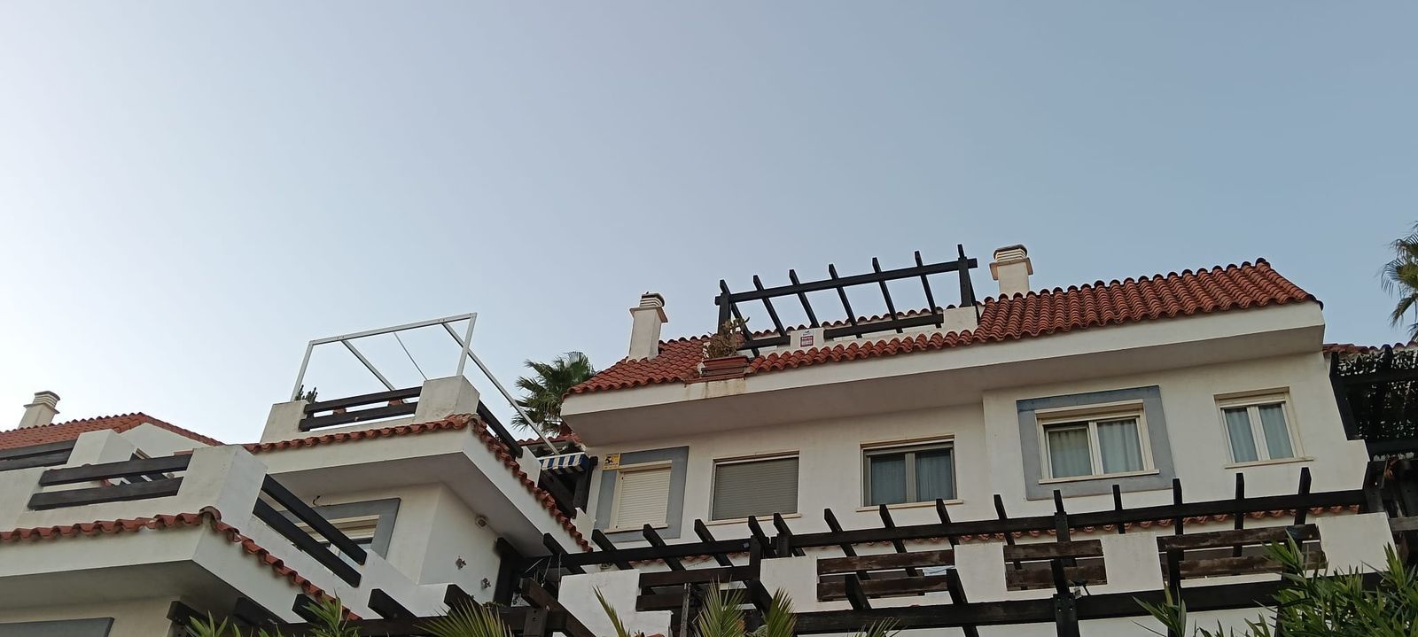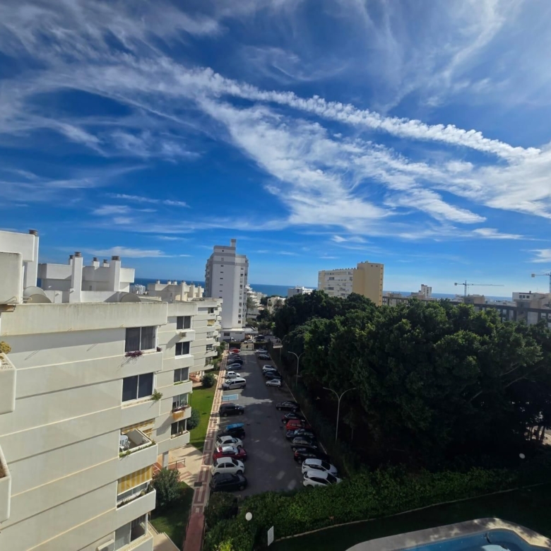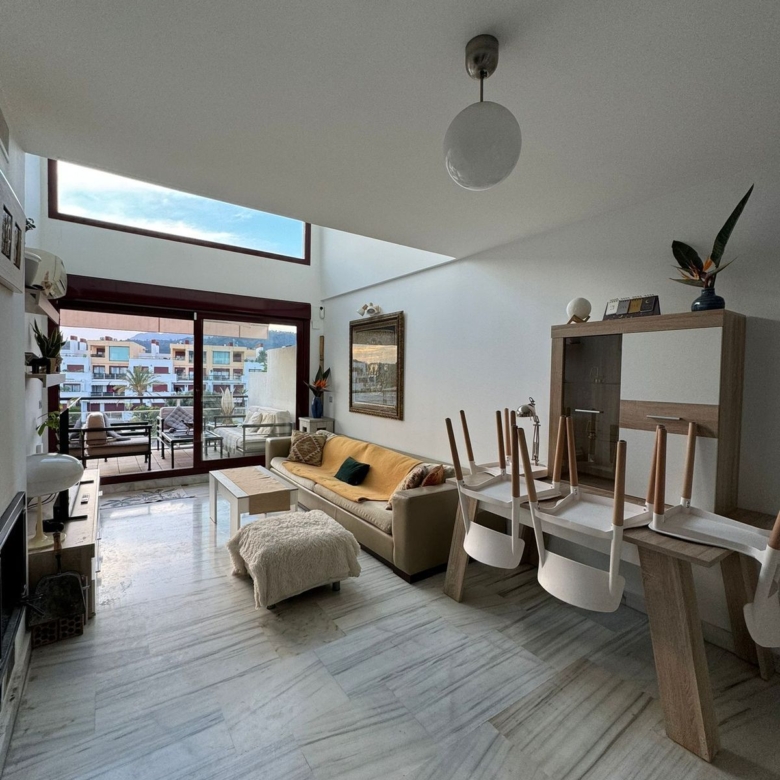 The duplex flat is accessible via the front on the ground floor, while the rear, with views of the sea and the surrounding area, is located higher up, hence the penthouse. The covered parking spaces have a total area of 82m², making it easy to park 1-2 cars. These are located on the other side of the flat, a few metres from the entrance.
