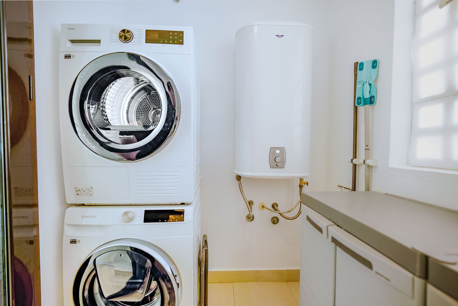 The open-plan living and dining area connects seamlessly with a fully equipped kitchen fitted with high-quality Siemens and Bosch appliances. A separate utility room with washer and dryer adds practicality. The property also features hot and cold air conditioning throughout, underfloor heating in the bathrooms, and excellent natural ventilation thanks to its elevated position.