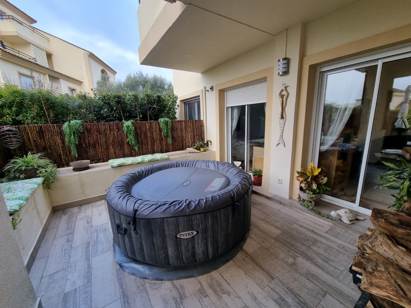 The apartment features a private enclosed garden and a large, newly tiled terrace, ideal for relaxing or entertaining. Inside, there is a spacious open-plan living and dining area with a wood-burning fireplace and direct access to the terrace, creating a warm and inviting atmosphere.